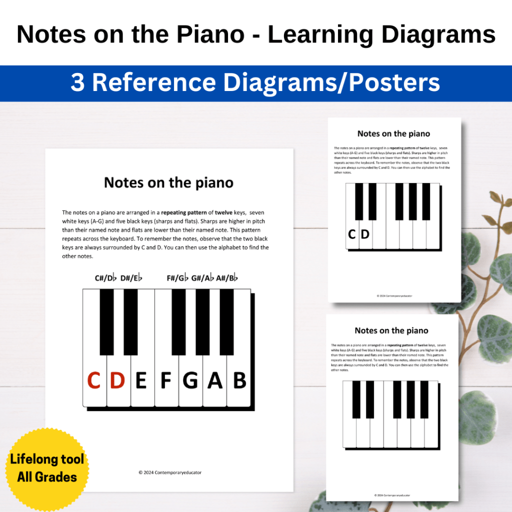 Introduce your students to the world of piano with our Notes on the Piano/Keyboard – 3 Learning Reference Diagrams/Posters. This set of diagrams is thoughtfully crafted to support students at every stage of their learning journey, from initial familiarization to mastery of note locations on the keyboard. Each diagram is designed to cater to different learning styles and activities, ensuring a comprehensive and engaging experience.